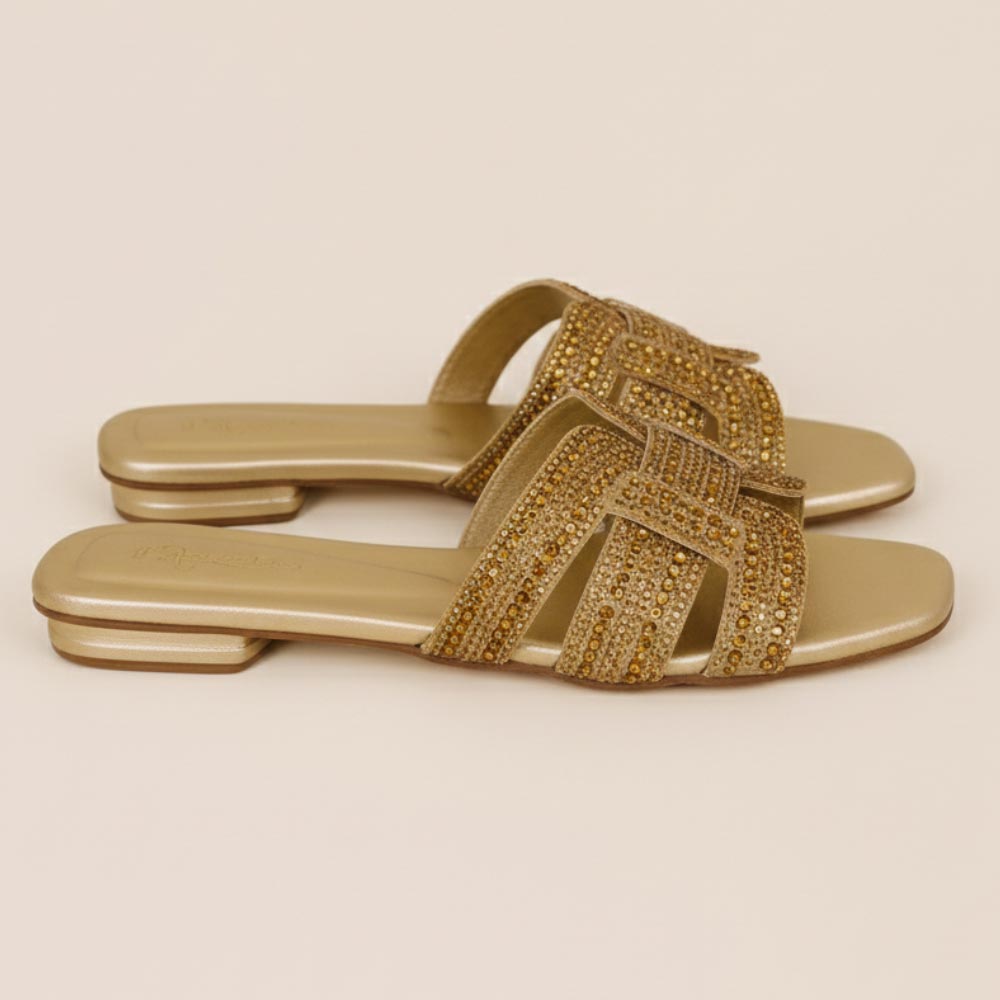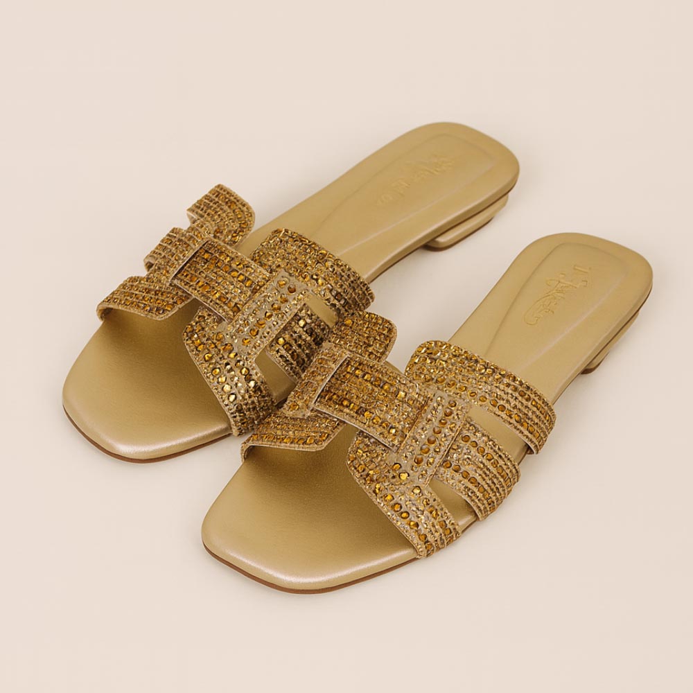 This refined embellished slipper features shimmering crystal-detailed straps on a soft metallic gold base adding a graceful glow to both everyday and festive looks.
